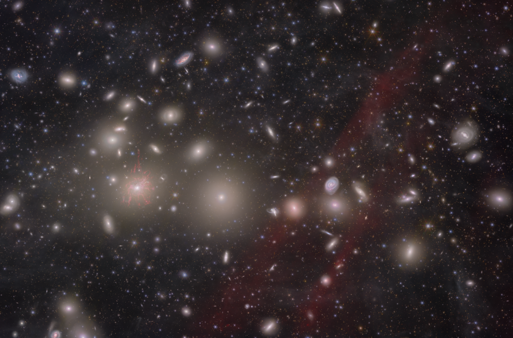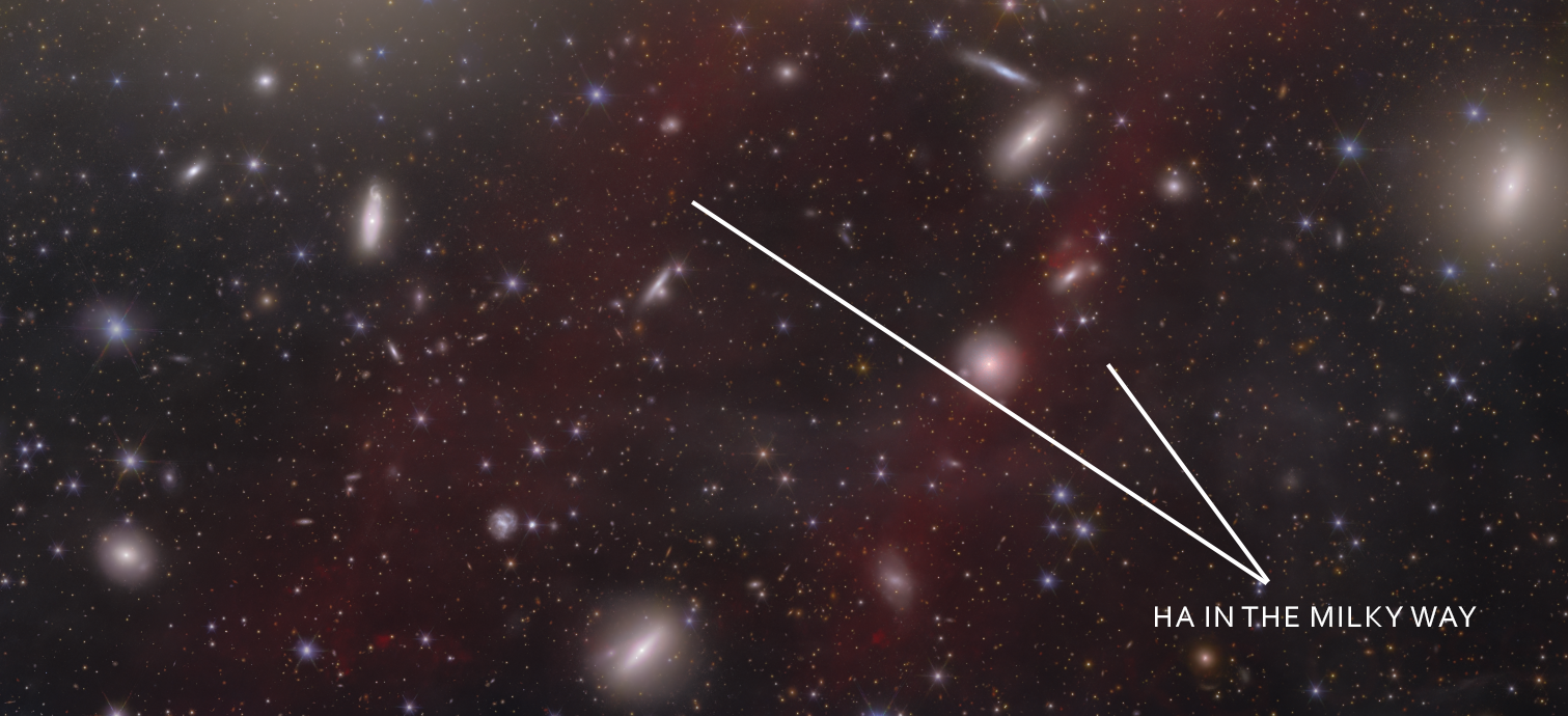 Deux ans plus tard, voici une nouvelle version enrichie de cette image. Elle intègre cette fois l’avant-plan galactique, comprenant donc les cirrus mais aussi l’hydrogène ionisé du milieu interstellaire, ainsi que de l’hydrogène ionisé propre à l’amas lui-même, visibles dans certaines de ses galaxies.