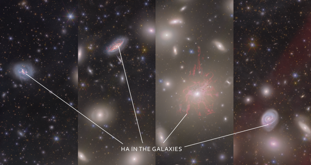On trouve aussi ce gaz dans les galaxies de l’amas. Cependant, en raison de leur grande distance (environ 240 millions d’années-lumière), la raie Hα qu’elles émettent est décalée vers le rouge par l’expansion de l’Univers, faisant apparaître cette lumière à une longueur d’onde légèrement plus grande que celle observée dans la Voie Lactée.