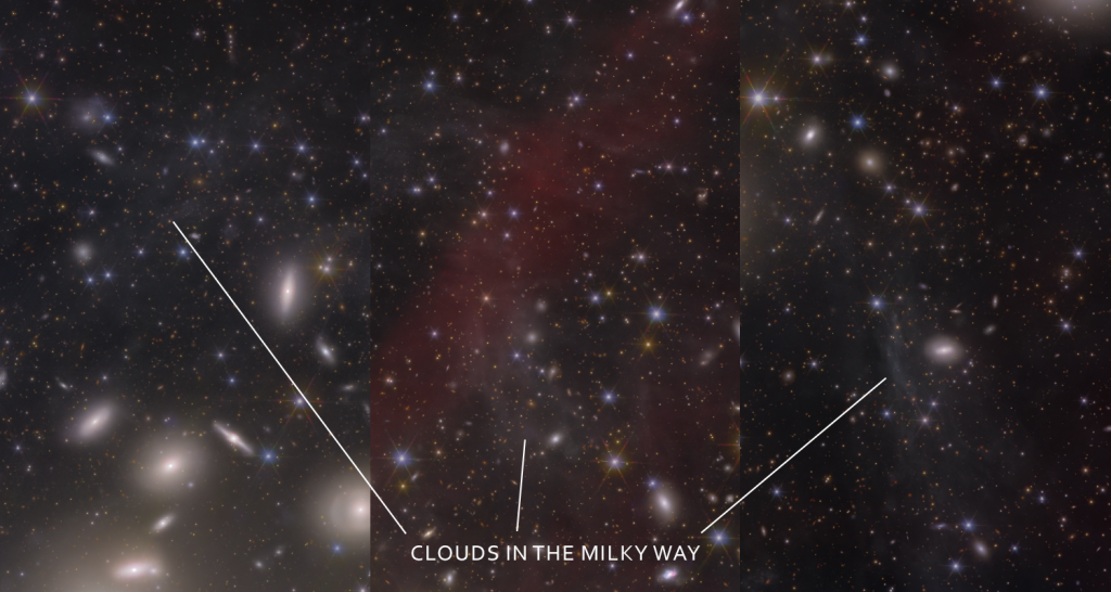 Il y a deux ans, le télescope spatial Euclid dévoilait ses premières images. Parmi elles figurait une vue de l’amas de Persée, révélant notamment des centaines de galaxies naines alors inconnues. Cette image montrait l’amas isolé de tout élément diffus du milieu interstellaire de notre galaxie présent sur la ligne de visée : des cirrus galactiques très marqués en raison de la basse latitude galactique de l’amas.